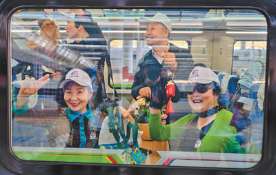 中老铁路国际旅客列车在昆明南站开行,车上乘客向窗外人群挥手致意。